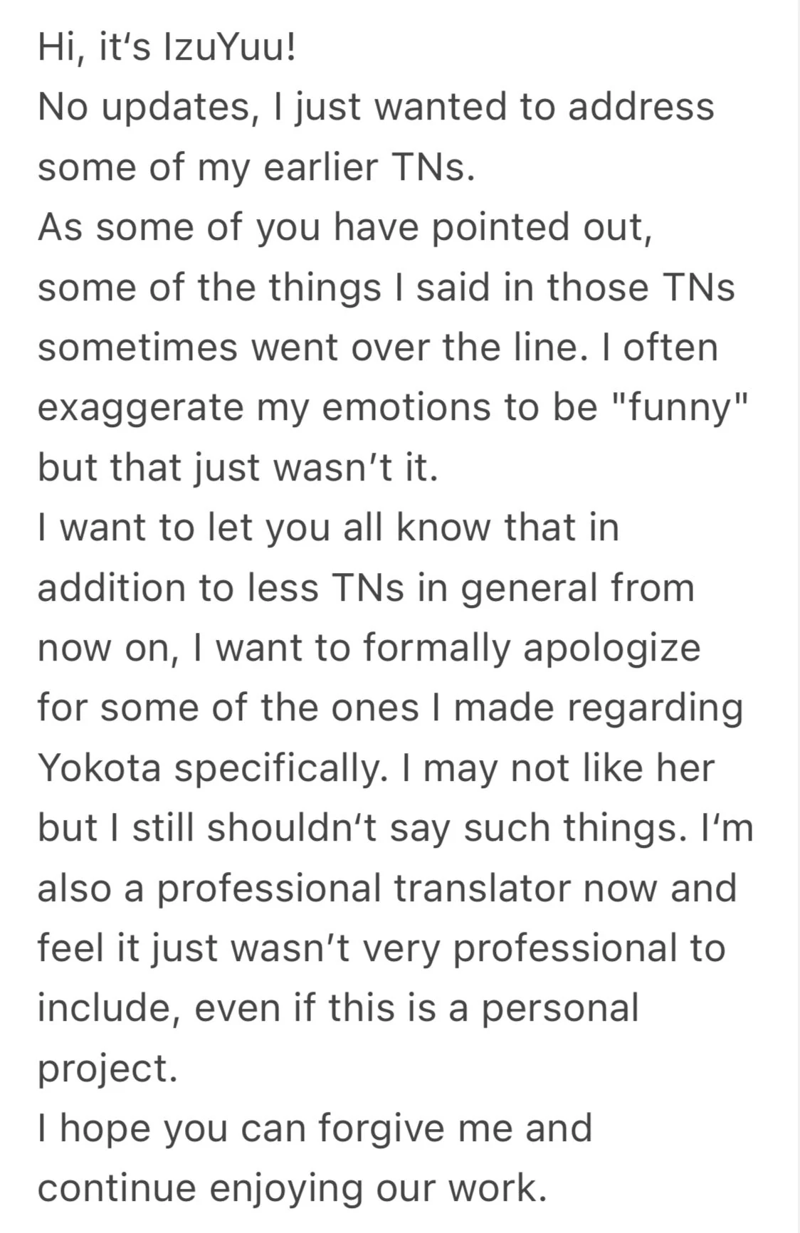 Quick note about T/Ns until now and going forward from IzuYuu